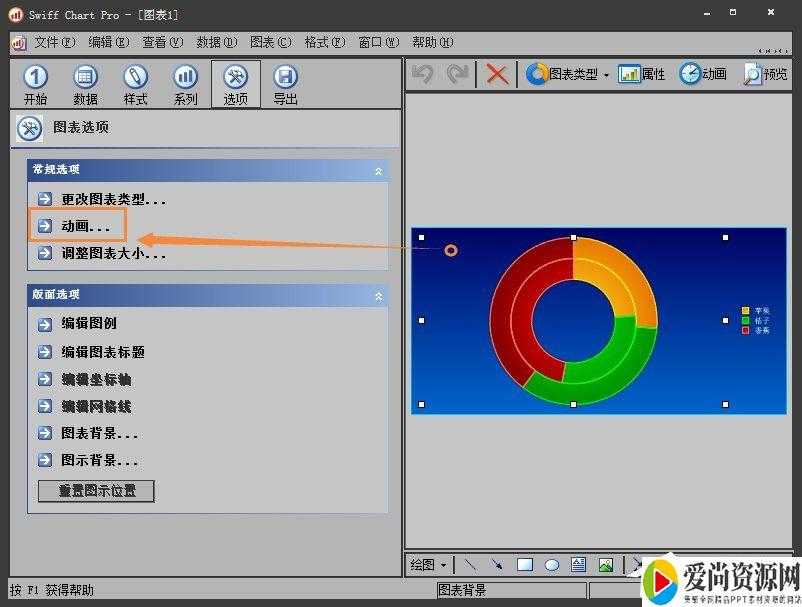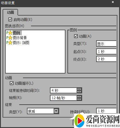 5、既然我们说了要做动画效果的图表,目前也仅仅是静态图而已,这时候点选上图右侧栏中的“动画”,调出动画效果选择界面。这里根据我们所选的饼图提供了动画效果,包括起止时间,播放速度(帧频)都可以选择。
