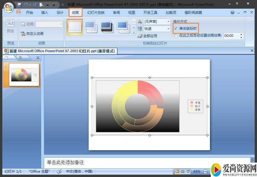 10、大写的囧,为什么是个黑框不是刚才制作的图表动画?不管他,先调整大小,然后切换到“动画”选项卡,在“开始”中选择播放模式,小编建议这里选“单击时”便于控制。