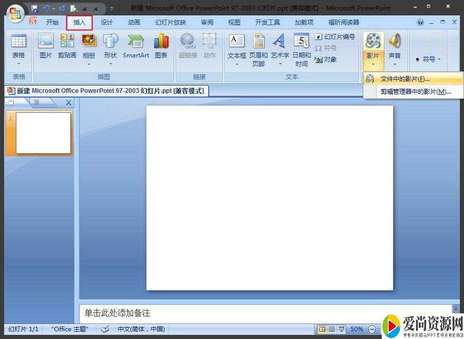 9、接下来打开PPT并切换到“插入”选项卡,在右侧点选“影片—文件中的影片”,选中刚才保存的图表动画文件。