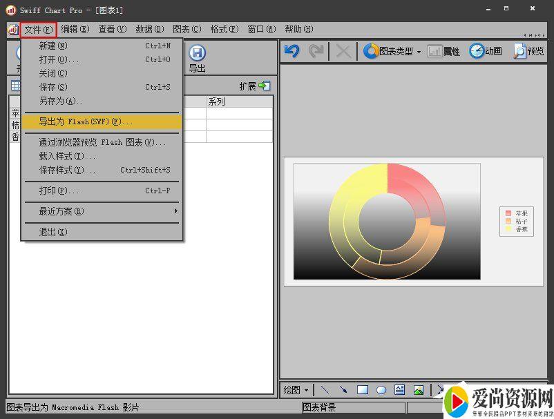 8、确定数据表格制作完毕后,点击SwiffChart“文件—到处为Flash(SWF)”导出为动画文件,这时还可以对导出动画图表的尺寸大小进行修改。另外建议导出后,再点选“另存为”将你制作的图表功能文件保存一份,方便以后的修改(另存为文件格式为*.sfc)。