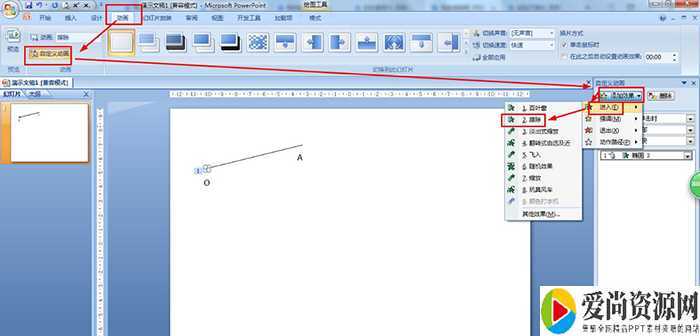 同样按以下顺序选择O文本框、直线、A文本框,然后按上述步骤设置擦除动画。