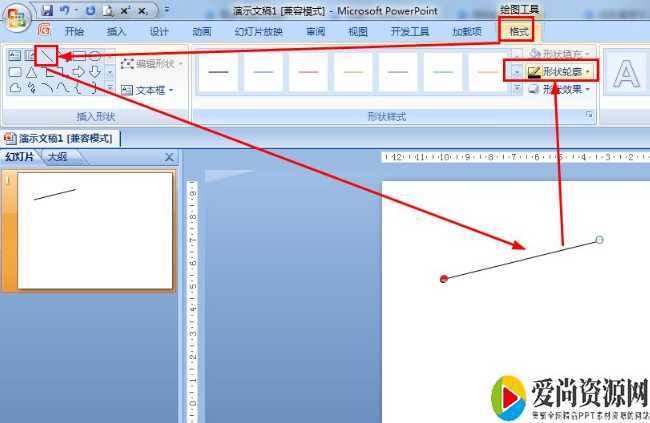 在选择小圆点的状态下点击格式——在插入形状中选择直线,画一条直线与小圆点相连并设置形状轮廓为黑色。