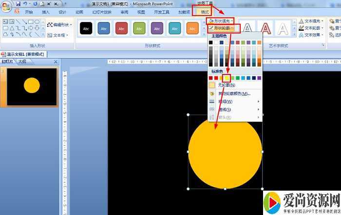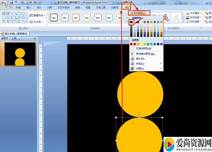 选择黄色圆形——按住Ctrl键拖动复制一个圆形——在格式中设置为黑色(与背景色一样的颜色)——移动到原圆形的正下方。