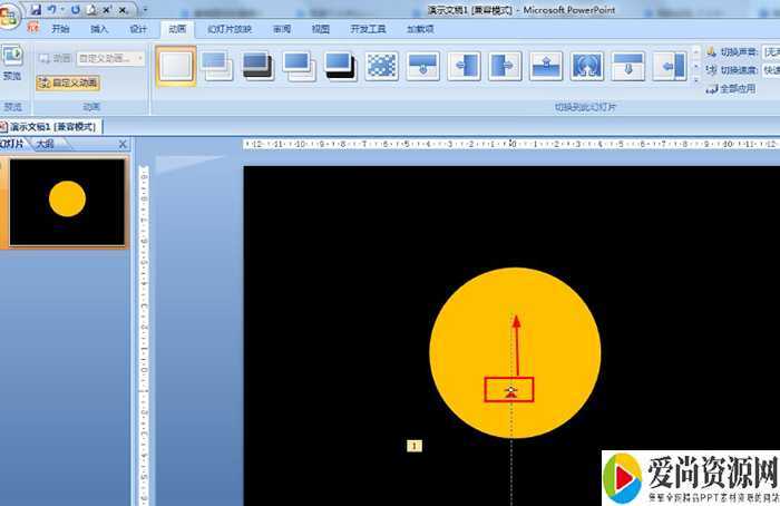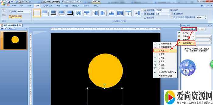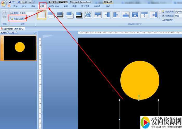 选择黑色圆形——点击动画——自定义动画。