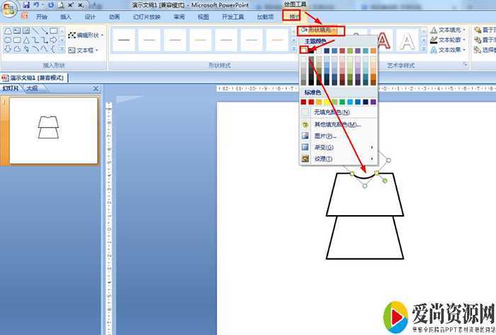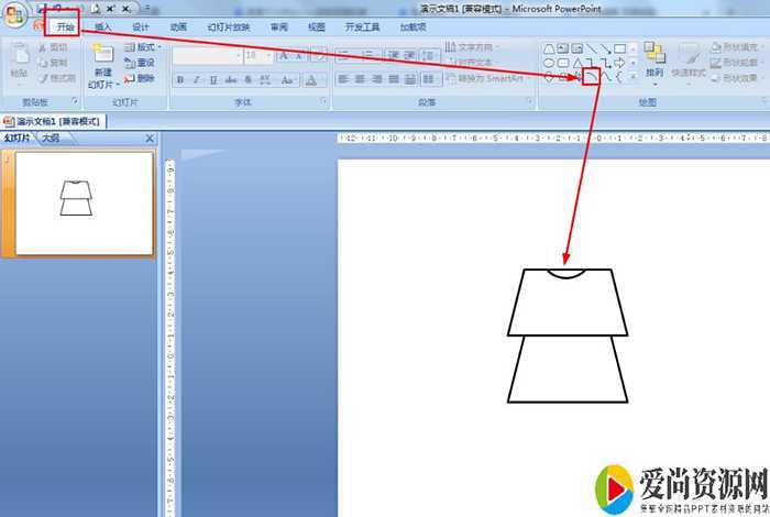 点击开始——在绘图中选择弧形,在第一个梯形上边的中间画弧形。