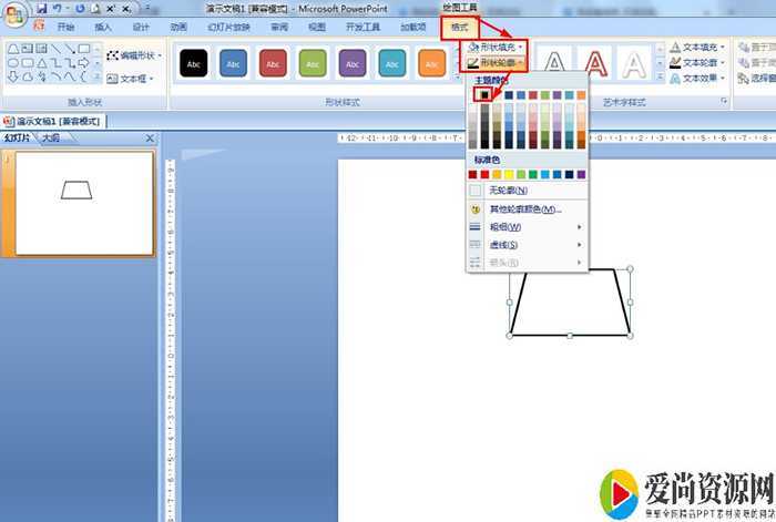 点击选择弧形——点击格式——形状填充——选择白色(与背景色一样),白色部分遮住梯形上边的一部分。
