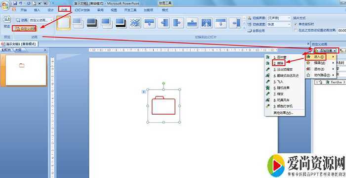 点击动画——自定义动画——添加效果——进入——选择擦除,效果设置为从顶部。