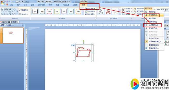 最后把打开状态文件夹符号放置在闭合的那个上面——全选形状——格式——对齐——选择左右居中和上下居中。