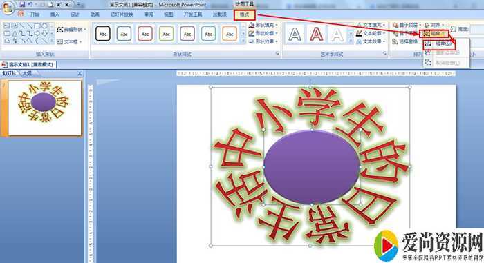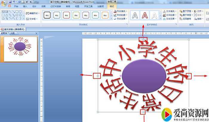 按住艺术字的四条边的中间拖拉,调整艺术字文本框的大小,让艺术字正好围绕着圆形。