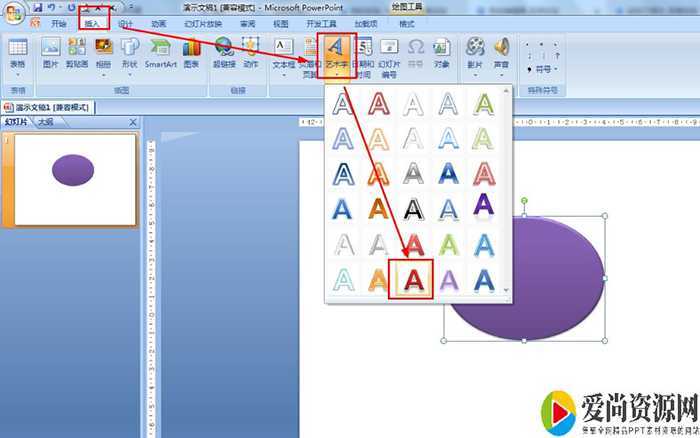 点击插入——形状——选择椭圆,画一个符合自己要求的椭圆或圆形——在格式中选择一种形状样式。