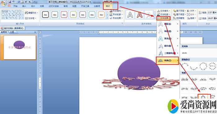 选择艺术字——点击格式——文本效果——点击转换——选择:圆形。
