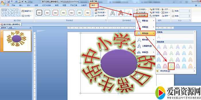 选择艺术字——再点击格式——文本效果——发光——选择强调文字颜色3的效果。