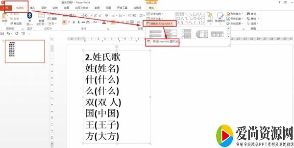 3.点击HOME——转换为SmartArt——其他SmartArt图形。