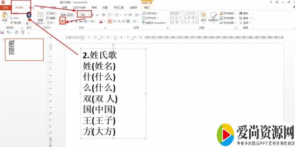 2.再在HOME(开始)菜单下设置字体大小为40,加粗。