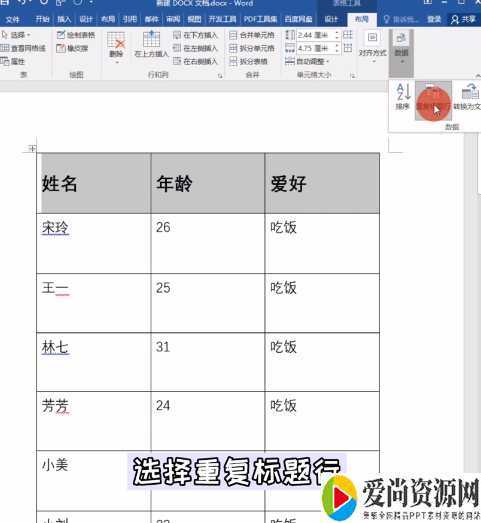 当前位置: 首页word教程正文 1、我们选中表头,在布局选项卡中点击数据 2,选择重复标题行,跨页的表格就能显示表头,你学会了吗? 声明:本站所有文章,如无特殊说明或标注,均为本站原创发布。任何个人或组织,在未征得本站同意时,禁止复制、盗用、采集、发布本站内容到任何网站、书籍等各类媒体平台。如若本站内容侵犯了原著者的合法权益,可联系我们进行处理。ppt教程 普通 打赏 收藏 海报 链接