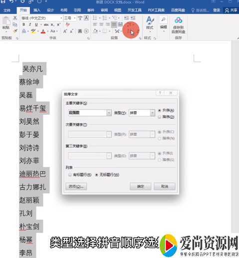 2、然后再找到开始选项卡的排序,按钮类型选择拼音,顺序选择声序,就是从a到z进行排序,点击确定