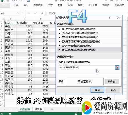 4、然后再等于找到修改之前的选中第一个单元格,按住F4调整到正确的一个格式