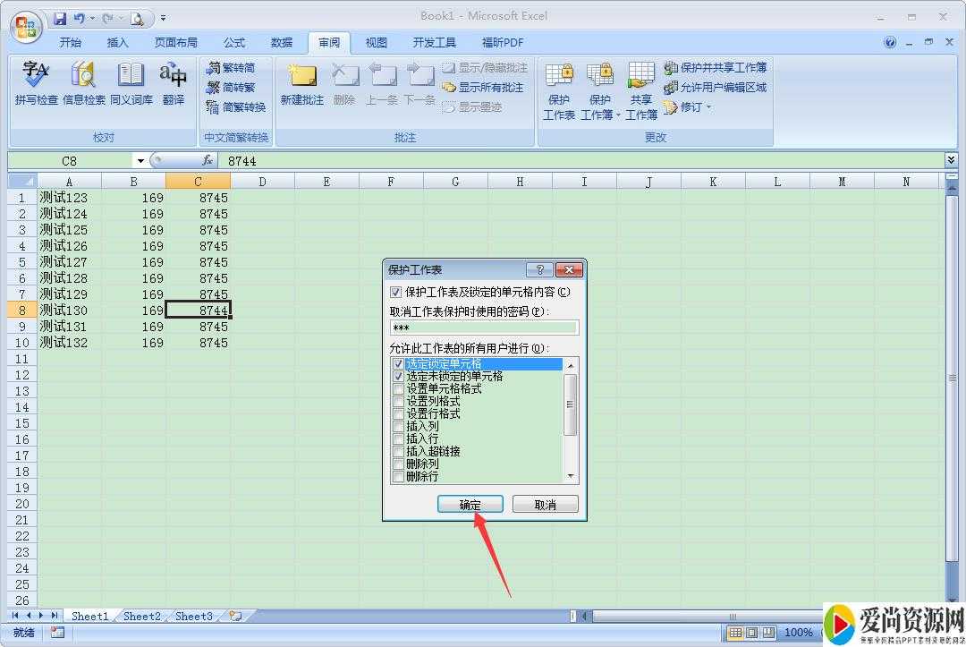 选取欲保护的文件,依次点击“审阅”、“保护工作表”;