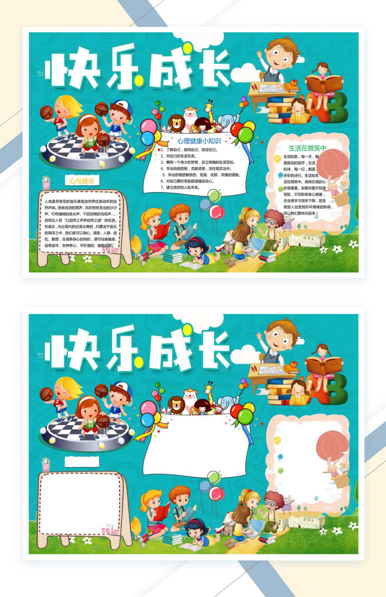 本作品内容为 蓝绿色快乐成长word心理健康手抄报,格式为 doc,大小 3.65MB,页数为 1, 比例为,请使用 word软件打开,作品中的文字与图均可以修改和编辑,图片更改请在作品中右键图片并更换,文字修改请直接点击文字进行修改,也可以新增和删除作品中的内容。