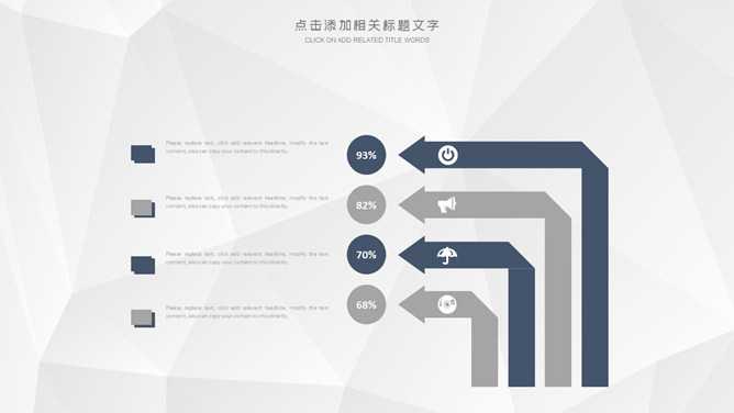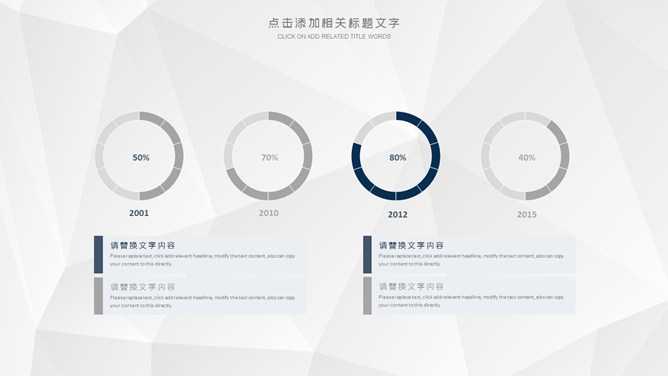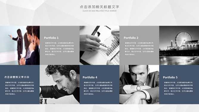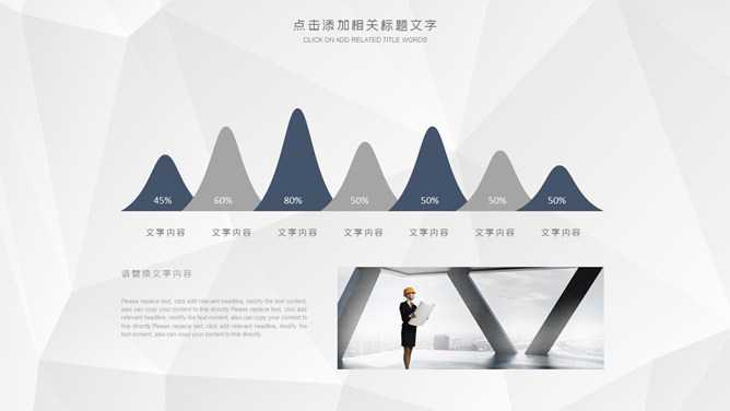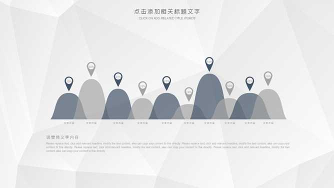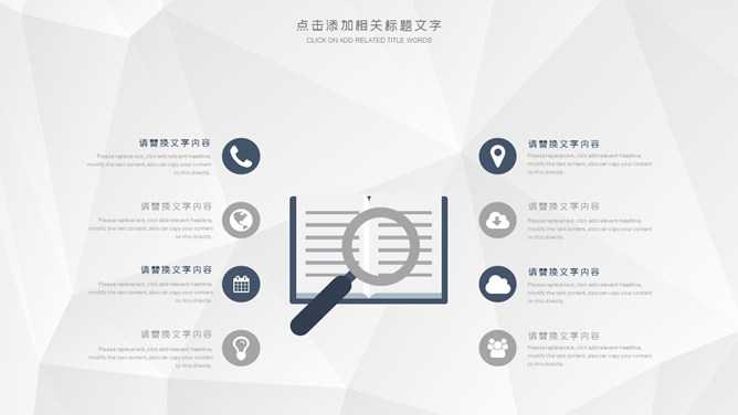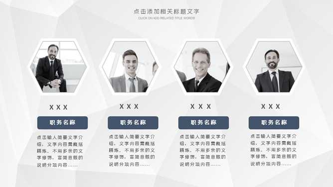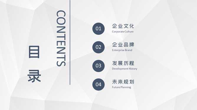 大气公司企业简介PPT模板。一套公司介绍幻灯片模板,灰色低面多边形背景,大气稳重深蓝配色,页面类型丰富实用。