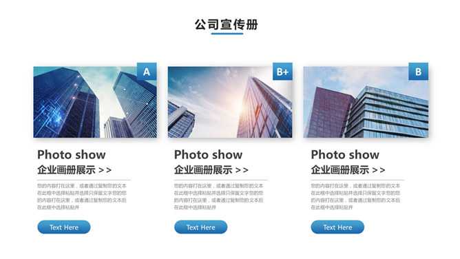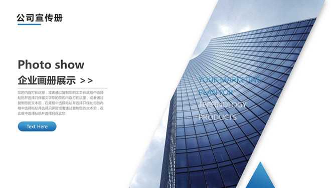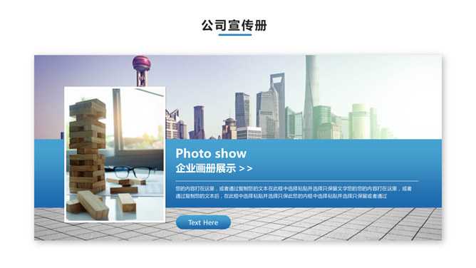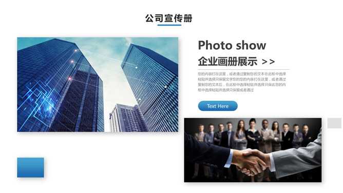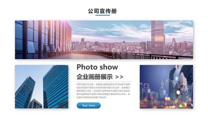 公司宣传介绍画册PPT模板。一套公司企业宣传介绍简介幻灯片模板,包含多种创意图片排版,简约大气,动态播放。