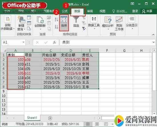 3、类别排序完成,此时需要将红色字体集中在顶端,还是单击“数据”选项卡中的“排序”。