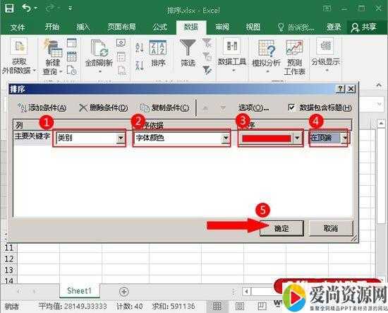 4、在弹出的“排序”对话框中选择“类别”,排序依据为“字体颜色”,次序为红色,位置设置为“在顶端”,然后单击“确定”按钮。