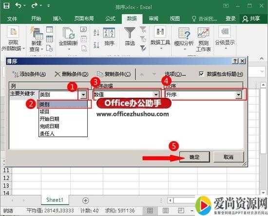 2、在弹出的“排序”对话框中,将主要关键字选为“类别”,排序依据为“数值”,次序为“升序”,然后单击“确定”按钮。