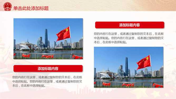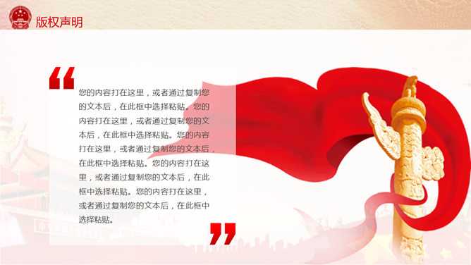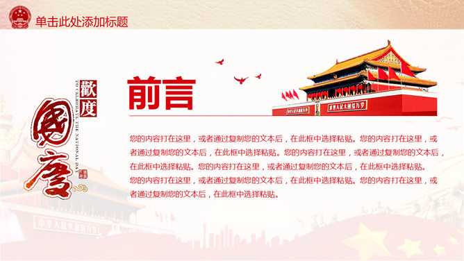当前位置: 首页PPT模板节日模板国庆节正文 声明:本站所有文章,如无特殊说明或标注,均为本站原创发布。任何个人或组织,在未征得本站同意时,禁止复制、盗用、采集、发布本站内容到任何网站、书籍等各类媒体平台。如若本站内容侵犯了原著者的合法权益,可联系我们进行处理。ppt举国模板 华夏行水管理员永久会员 打赏 收藏 海报 链接