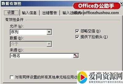 2、在“来源”下方的文本框中输入“=姓名”。单击“确定”。