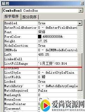 4、在“属性”窗口中,将ListFillRange属性设置为“'1月工资'!B3:B14”。关闭“属性”窗口 。