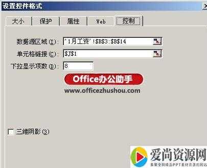 在“设置控件格式”对话框中选择“控制”选项卡,设置“数据源”区域为“'1月工资'!$B$3:$B$14”(或“姓名”),设置“单元格链接”为$J$1,如图。