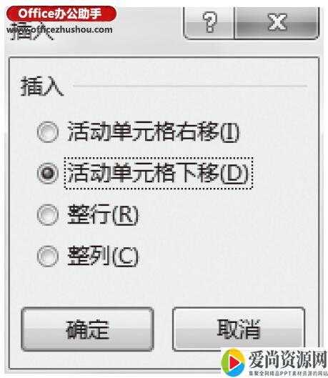 步骤2:按下Ctrl+Shift+加号(+)组合键,弹出“插入”对话框,该对话框中“插入”标签下方区域默认选择“活动单元格下移”,单击“确定”按钮,如图2所示。