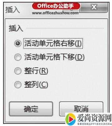 步骤4:返回步骤2,在弹出的“插入”对话框中“插入”标签下方单击“活动单元格右移”单选按钮,单击“确定”按钮,如图4所示。