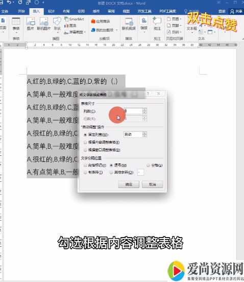 然后CTRL+C全选文本,点击插入,插入表格,点击文本转换成表格,在下面勾选逗号,勾选根据内容调整表格,点击确定,现在选项就对齐,最后设置表格无框线,就搞定了