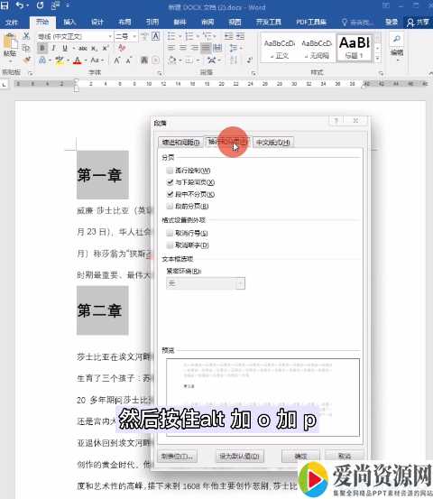 2. 然后按住ALT+O+P,打开段落设置在换行分页这里勾选段前分页,点击确定每一章都另起一页