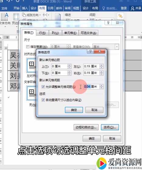 然后在布局选项卡中右键,选择表格属性,点击选项勾选调整单元格间距,改成0.5厘米,点击确定,然后选中表格,CTRL+E把表格居中,这样就完成了。