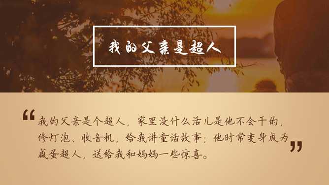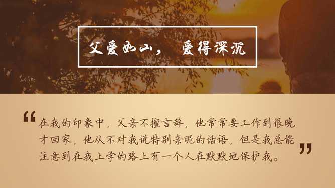 当前位置: 首页PPT模板节日模板父亲节正文 声明:本站所有文章,如无特殊说明或标注,均为本站原创发布。任何个人或组织,在未征得本站同意时,禁止复制、盗用、采集、发布本站内容到任何网站、书籍等各类媒体平台。如若本站内容侵犯了原著者的合法权益,可联系我们进行处理。ppt模板父亲节 华夏行水管理员永久会员 打赏 收藏 海报 链接