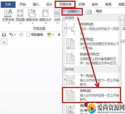 第一步:光标停留在第2页开始,选择“页面布局-分隔符-分节符-连续”。