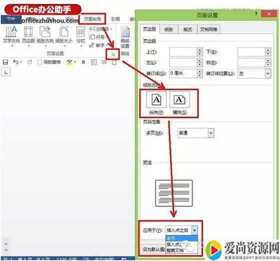 第一步:将光标定位在第2页第一行,选择“页面布局-纸张方向:横向-应用于:插入点之后-确定”。