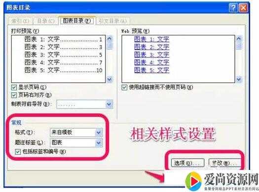 6、弹出图表目录的对话框,我们可以对相应的格式、样式进行设置,一般默认就可以了,不需要设置,弄好后,点击确定,如图。