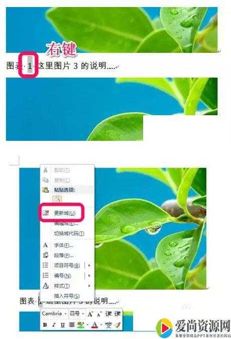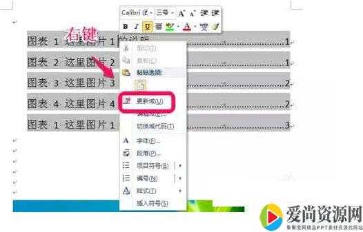 8、如果,我们对图表进行了修改,记得对我们的图表目录进行更新域,如图,点击右键,弹出菜单,选择更新域即可。